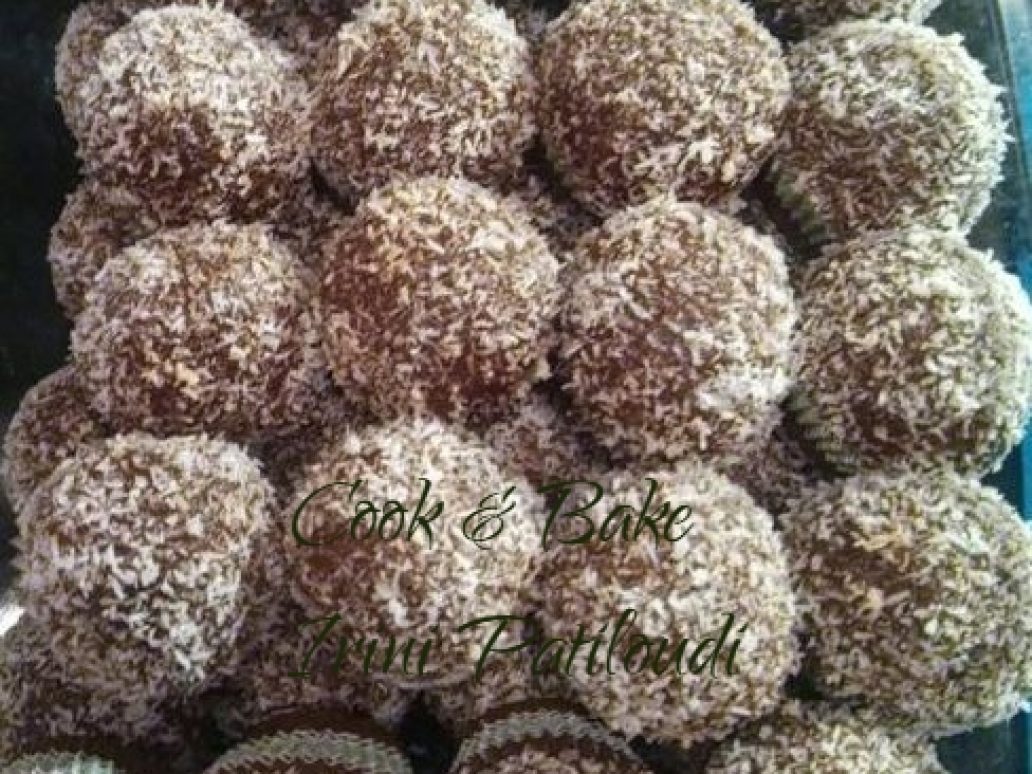 Σε ένα μπολ έχουμε αλεσμένα σε σκόνη τα πτι-μπερ και τα καρύδια μας. Σε μπεν μαρί λιώνουμε την σοκολάτα με την μαργαρίνη. Μόλις λιώσει βάζουμε την άχνη και το γάλα. Μόλις ενωθούν τα υλικά το κατεβάζουμε από τη φωτιά και προσθέτουμε το μέλι. Ανακατεύουμε καλά να λιώσει και το προσθέτουμε στα μπισκότα και καρύδια μας. Τα ανακατεύουμε καλά και τα βάζουμε ψυγείο για 30 λεπτά. Μετά τα πλάθουμε και τα κυλάμε στο ινδοκάρυδο. Σε χαρτάκι και στο ψυγείο.