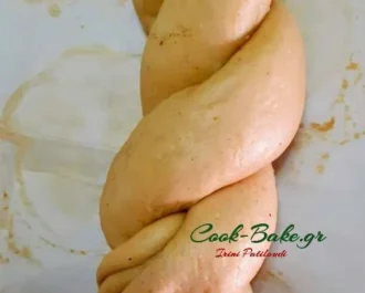 Ψήνουμε έτσι σε ταψί με χαρτί ψησίματος η σε μακρόστενη φόρμα βουτυρωμένη αφού έχει φουσκώσει αρκετά το τσουρέκι. Στους 150 βαθμούς αέρα η αντιστάσεις για 40 με 50 λεπτά το πολύ. Στα 40 λεπτά το βλέπουμε.