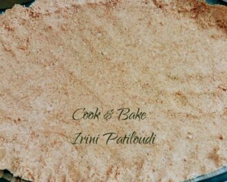 Αλέθουμε τα μπισκότα και τα ανακατεύουμε με το λιωμένο βούτυρο ίσα ίσα να μην είναι στεγνά τελείως. Τα πατάμε σε ένα πυρέξ ή φόρμα 28 εκ. Κρατάμε λίγο για το πασπάλισμα.