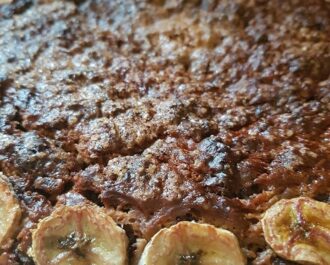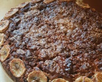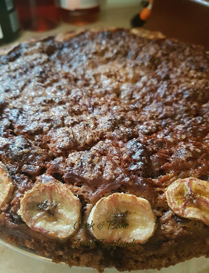 Την φόρμα ή το ταψί που θα βάλουμε το μείγμα θα το αλευροβουτυρώσουμε καλά. Βάζουμε το μείγμα μέσα στο ταψί. Αν θέλουμε μπορούμε να βάλουμε γύρω γύρω κομματάκια μπανάνας. Από πάνω ρίχνουμε λίγη ακόμα ζάχαρη για να καραμελώσει. Ψήνουμε σε προθερμασμένο φούρνο στους 180 C για 45-60 λεπτά. ανάλογα τον φούρνο μας. Κάνουμε το γνωστό κόλπο με το μαχαίρι για να δούμε αν είναι έτοιμο.