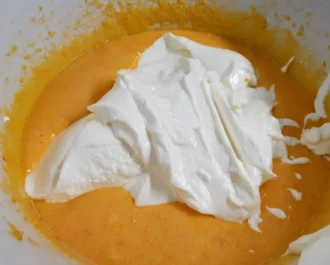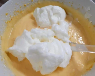 Ενώνουμε απαλά και λίγη λίγη την μαρέγκα με μία κουτάλα.