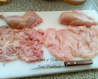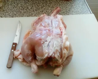 Μετά κόβω τα μπούτια και τα ξεκοκαλίζω και ανοίγω όσο μπορώ το κρέας. Το ίδιο κάνω και με το στήθος. Πλένω καλά το κρέας και την πέτσα και τα στραγγίζω από τα νερά. Βάζω σε μια λεκάνη τα κρέατα και τους ρίχνω όλα τα μπαχαρικά συν την μουστάρδα και τα ανακατεύω με τα χέρια μου.