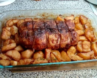 Μετά αρχίζω να διπλώνω τα κρέατα σε ρολό μαζί με την πέτσα και δένω με σπάγκο. Τοποθετώ το ρολό στο πυρέξ και αφού κόψω πατάτες τους βάζω αλάτι, πιπέρι και πάπρικα και τις στρώνω γύρω από το ρολό.