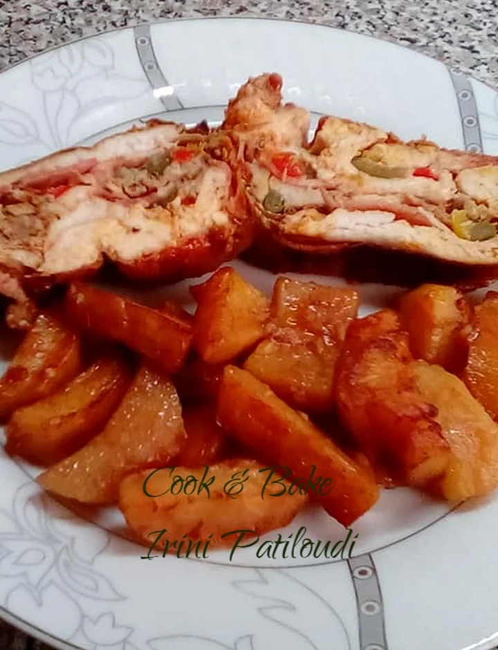 Kοτόπουλο ρολό σπιτικό, γεμιστό με μπέικον, κεφαλογραβιέρα και πιπεριές πολύχρωμες συνοδευμένο με πατάτες της φίλης Vaïa Pouliasi. Μέλος της Ομάδας μας, Συνταγές, εύκολες, γρήγορες και νόστιμες... Ευχαριστούμε!