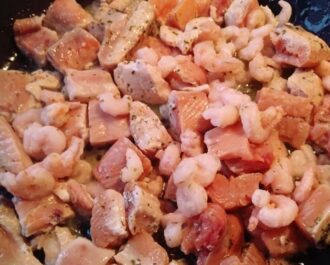 Αφήνουμε λίγο βούτυρο να κάψει σε κατσαρόλα ή τηγάνι και ρίχνουμε τον φρέσκο σολομό κομμένο σε κομμάτια και τις γαρίδες να σοταριστούν και να ψηθούν ελαφρά. Τα βγάζουμε σε ένα πιάτο και συνεχίζουμε με τα κρεμμύδια και το σκόρδο. Αν χρειαστεί προσθέτουμε ακόμα λίγο βούτυρο η λάδι.