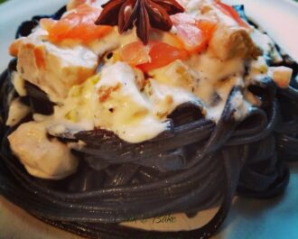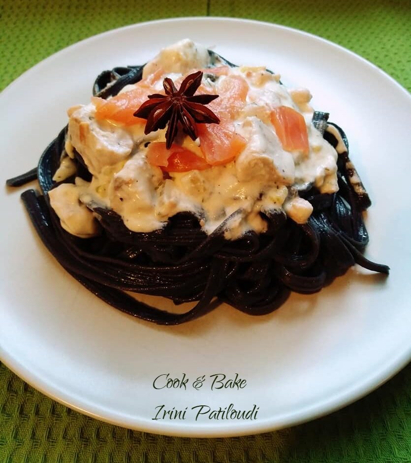 Linguine μαύρα (με μελάνι σουπιάς) με φρέσκο και καπνιστό σολoμό της φίλης Matia Alvanou.