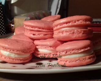 Χτυπώ τα ασπράδια με 1/4 φλιτζανιού άχνη μέχρι να γίνει μαρέγκα. Προσθέτω την σκόνη αμυγδάλου και την υπόλοιπη ζάχαρη. Εδώ έβαλα και λίγες σταγόνες χρώμα ζαχαροπλαστικής κόκκινο μέχρι να πάρει το ροζ χρώμα. Ανακατεύω απαλά με σπάτουλα. Βάζω σε κορνέ την ζύμη και κάνω κύκλους σε λαδόκολλα στο ταψί .Αφήνω τους κύκλους για μια ώρα να σταθούν.