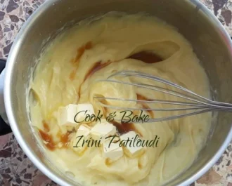 Ρίχνουμε αυτό το μείγμα στο κατσαρολάκι ανακατεύοντας συνεχώς μέχρι να έρθει σε βρασμό και να πήξει. Κατεβάζουμε από τη φωτιά και προσθέτουμε το βούτυρο και τη βανίλια. Ανακατεύουμε καλά μέχρι να λιώσει το βούτυρο.