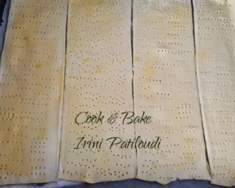 Κάνουμε τρύπες με το πιρούνι στις λωρίδες γιατί δεν θέλουμε να μας φουσκώσει η σφολιάτα στο ψήσιμο. Αλείφουμε και την πάνω πλευρά με βούτυρο και πασπαλίζουμε με τα άλλα 3 κ.σ ζάχαρη. Ψήνουμε για 30' περίπου στους 180 βαθμούς. Αφήνουμε να κρυώσουν.