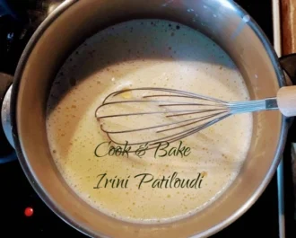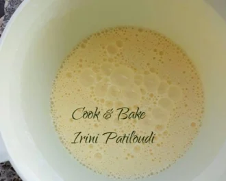 Στο μίξερ χτυπάμε το άλλο μισό γάλα, το αυγό, τον κρόκο, το κορν φλάουρ.